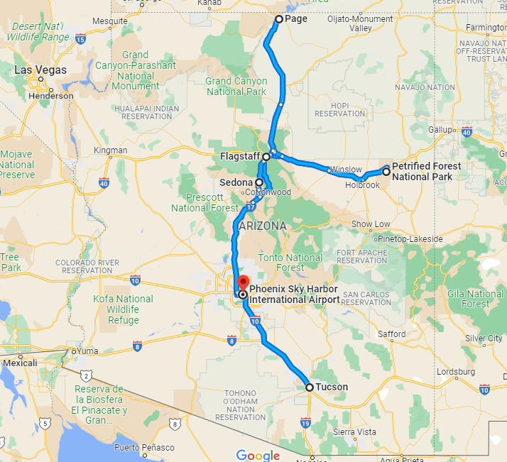 I’ll be honest, I thought my mom’s itinerary was pretty ambitious. We planned a 5-day trip to Arizona where we would all fly into Phoenix then rent a car a drive around. Instead of sticking to just one region of Arizona, we would be covering a lot of ground. The plan was to drive down to Tucson where we would spend one night and visit Saguaro National Park then head north to spend in a night in Flagstaff before visiting Petrified Forest National Park to the East. Then we would loop back and continue north to Page to visit Antelope Canyon, staying there two nights before driving back down to Phoenix to catch our flights home.