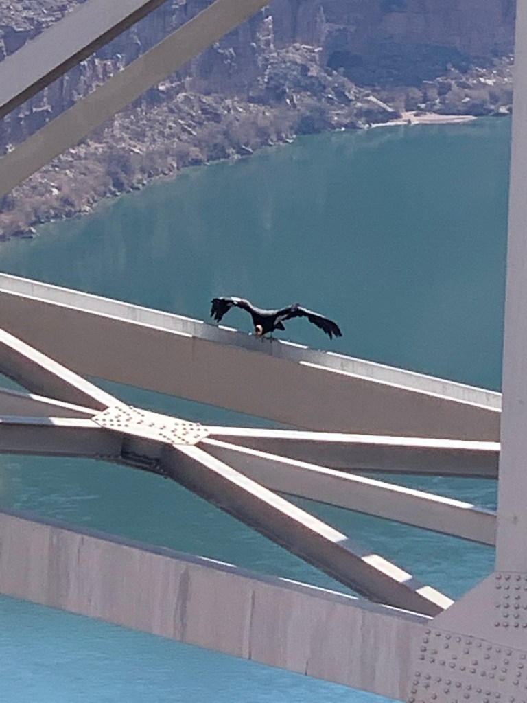 To visit the bridge, it is best to park at the Navajo Bridge Interpretive Center which includes a gift shop and restrooms. Then you can walk over the pedestrian bridge that crosses over the Colorado River and is parallel to the bridge for automobiles you just crossed. On the other side of the bridge there is some more parking and the set-up of what looks like a small market for local goods. As you are walking along the bridge, you can see the river below and then above in the sky and sometimes along the bridges or the rocky cliffs are the endangered California Condors. There were quite a few in the area when we were there and even a few amateur bird watchers set-up on the bridge to view their activity.