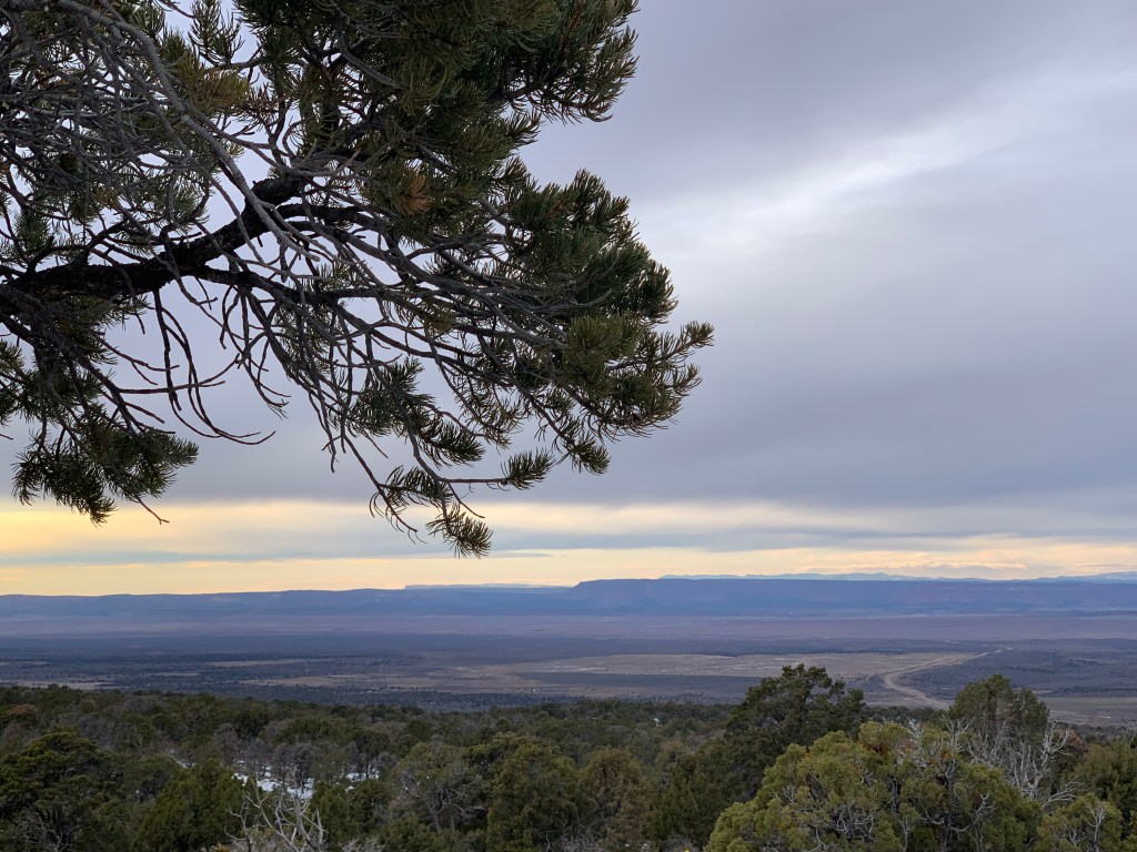 We then drove along the beautiful Vermillion cliffs with the red banded stone until we eventually entered Kaibab National Forest. Up to this point, the drive had been fairly easy with no elevation gains but on our way to our next stop, Le Fevre Overlook, there was quite a bit of elevation gain as we winded up the cliffs. This was unexpected because I did not see anything indicating it would turn into a more difficult drive and it was compounded by the fact that there was still snow (though it was not actually snowing) all along the forest and it was quite cloudy.