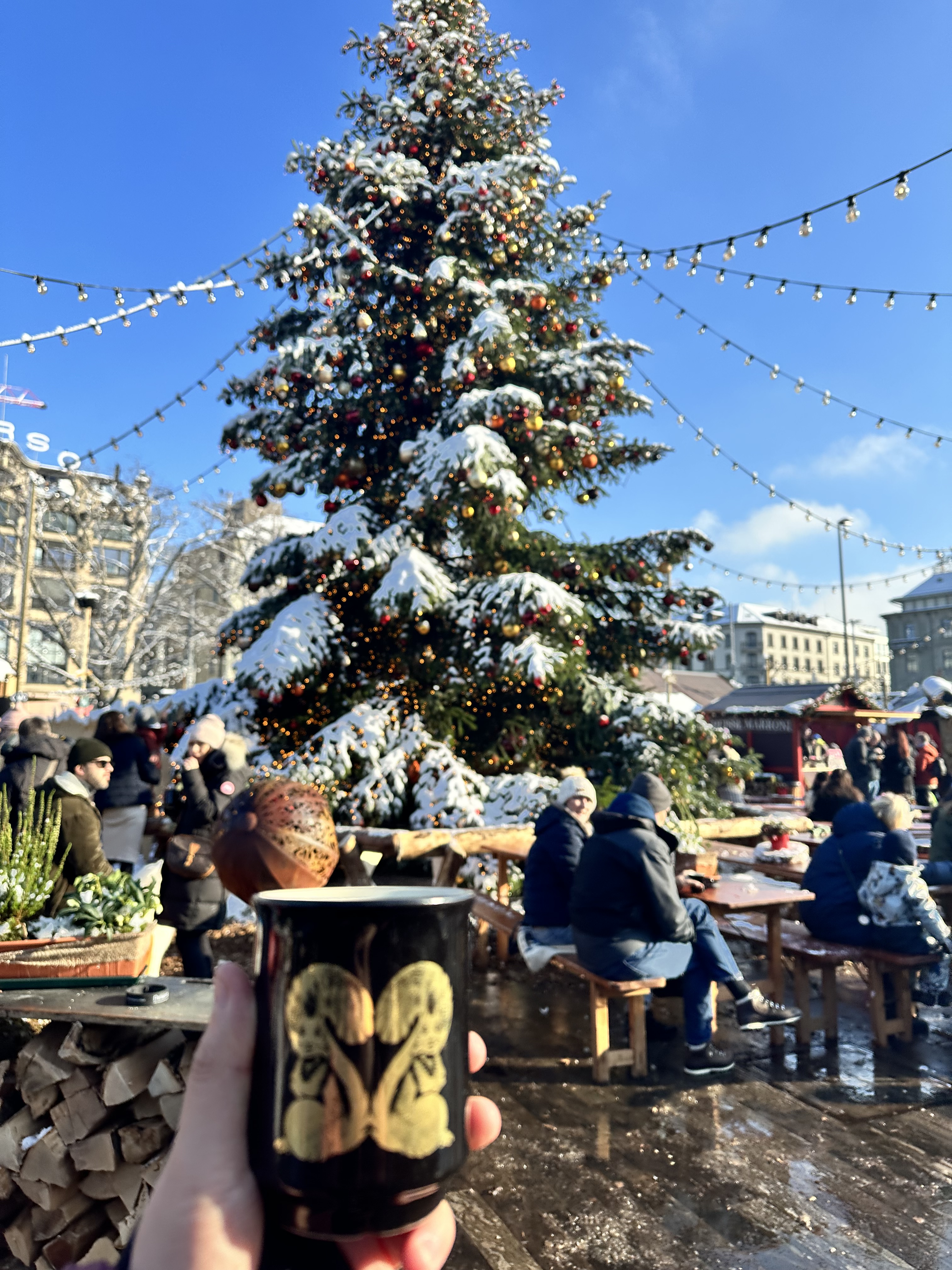 Since it was nearing lunchtime, our first stop would be at Zurich’s “Wienachtsdorf” (Christmas Village) at Sechseläutenplatz near the Opera House and along the lakeshore. This would be the first of many Christmas markets on this trip. This market is open from 11 AM to 10 PM, except on Sundays when it closes at 8 PM. The unique part about this Christmas market is that it has a lot of international food stalls such as Mexican tacos, Chinese baos and lots of other international cuisines. There are also stalls selling crafts, Christmas items and a bunch of other different things.