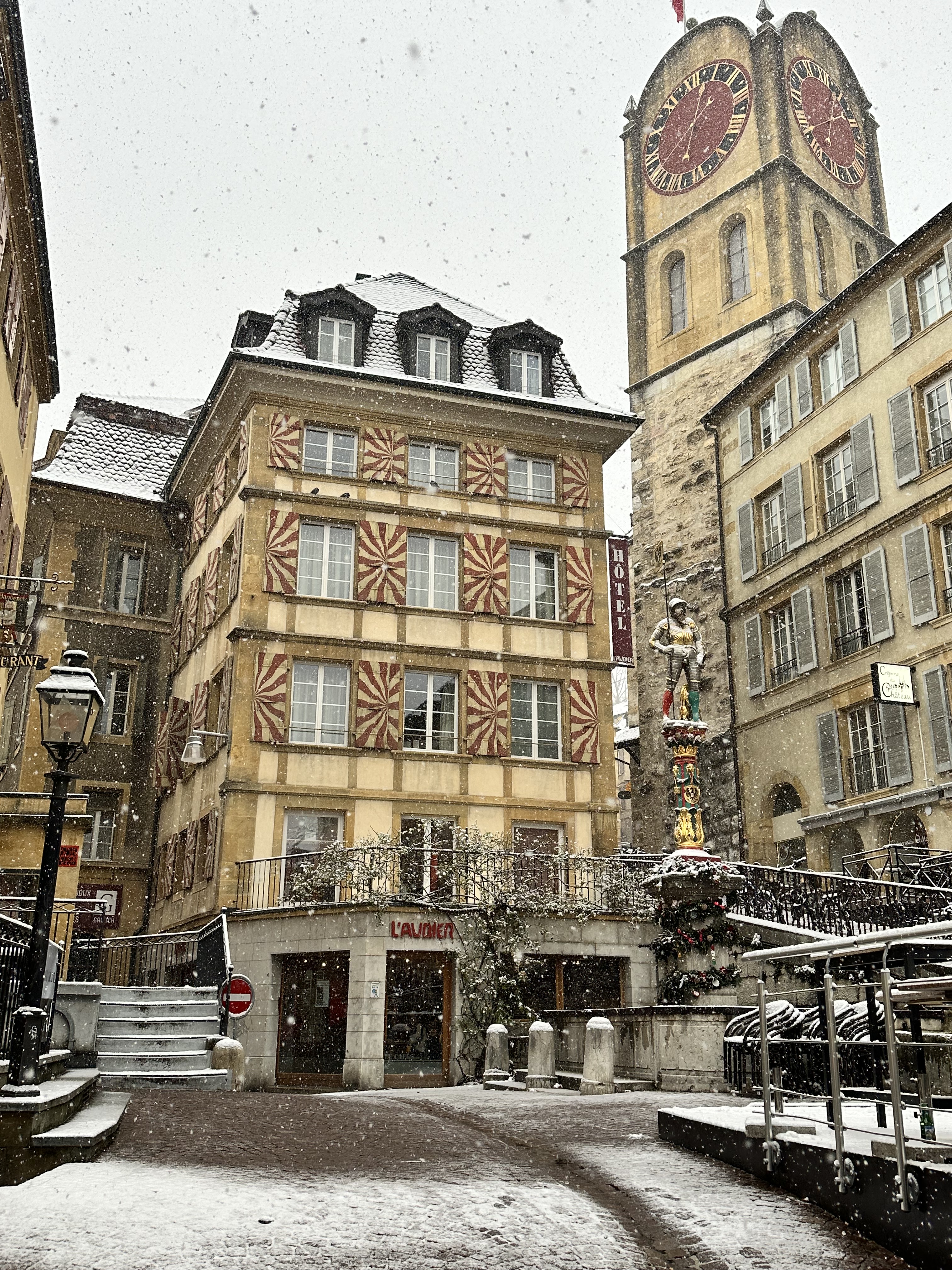On the way to Montreux, we stopped in a cute town called Neuchâtel for an hour or two so we could grab something for lunch or do some shopping. The tour director recommended a few restaurants with good soups since it was cold out with some small snow flurries. She also showed us a creperie but my mother and I decided to walk around the town and just get something light and quick for lunch since we were still pretty full from breakfast. We actually ended up wandering through and Aldi grocery store and happened to run into a staff member bringing out fresh baked goods. We each bought a freshly baked croissant and it was delicious and still warm from the oven. This was enough to tide us over until we got to Montreux.